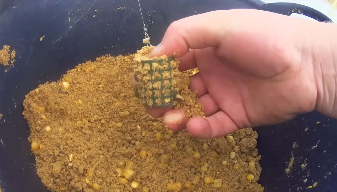 Сам процес займає менше хвилини. Спочатку заповніть годівницю прикормкою наполовину. Потім зробіть пальцем невелике заглиблення і покладіть у нього чайну ложку кукурудзяного пюре. Зверху закрийте все прикормкою, що залишилася, злегка ущільнивши її.