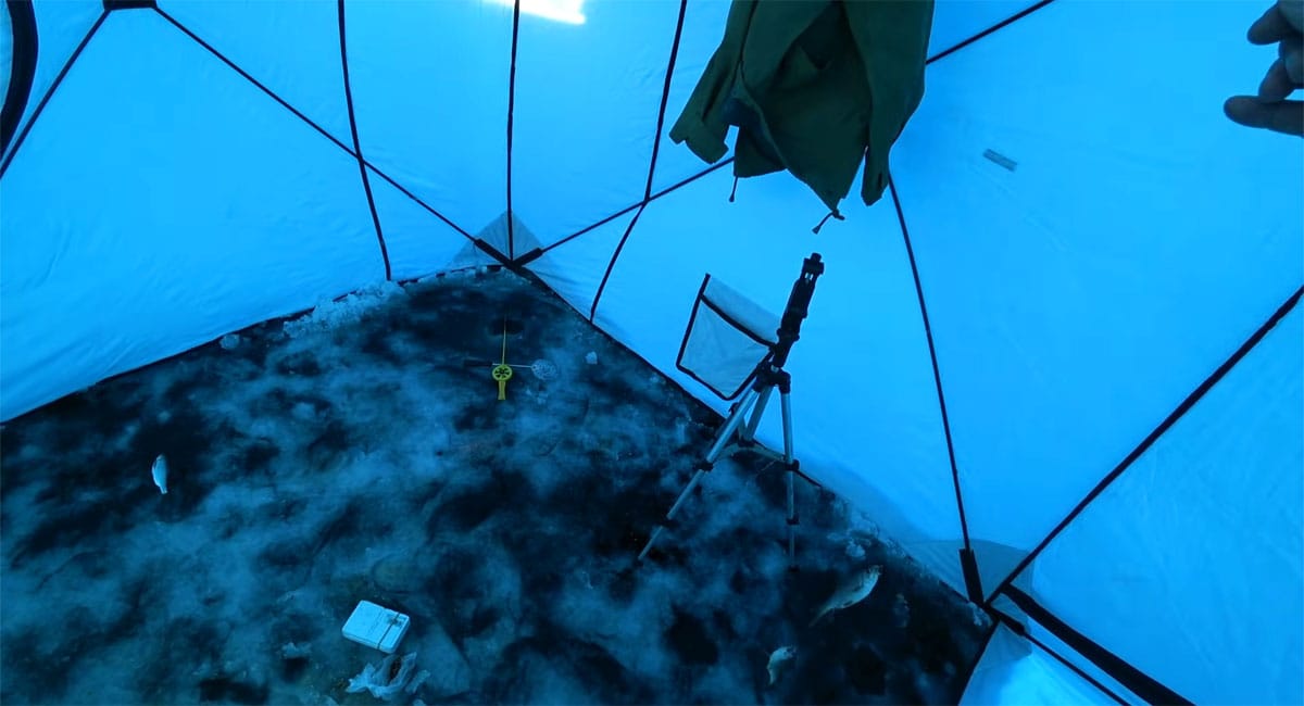 Кам’янське водосховище, ранок при -16°C і сильному вітрі. Без намету на льоду довго не простоїш, але рибу знайшли. Несподіванка дня – повний провал опариша і стабільна робота мотиля на глибині.