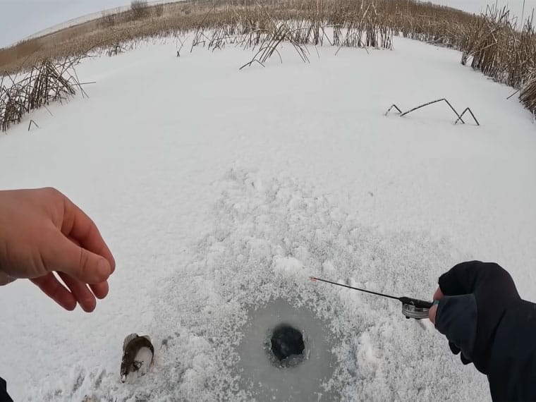 - при ловле на малых глубинах (до 2 метров) подбрасывайте по 5-7 личинок прямо в лунку каждые 15 минут.