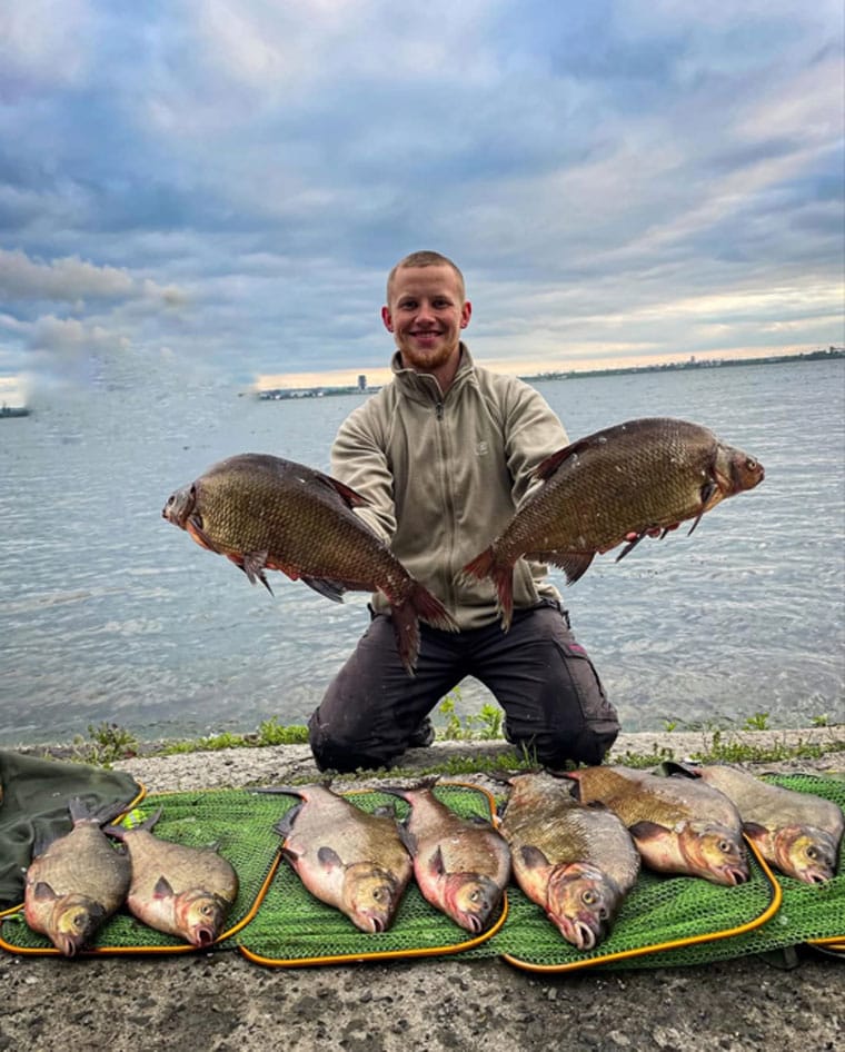 После каждого пойманного леща он забрасывал в пять закормочных кормушек. Ближе к вечеру рыба стала менее осторожной, и поклевки иногда происходили сразу на два фидера. Рыбалка продолжалась до 7 вечера, и к этому времени стало понятно, что самостоятельно извлечь садок с уловом из воды будет невозможно.