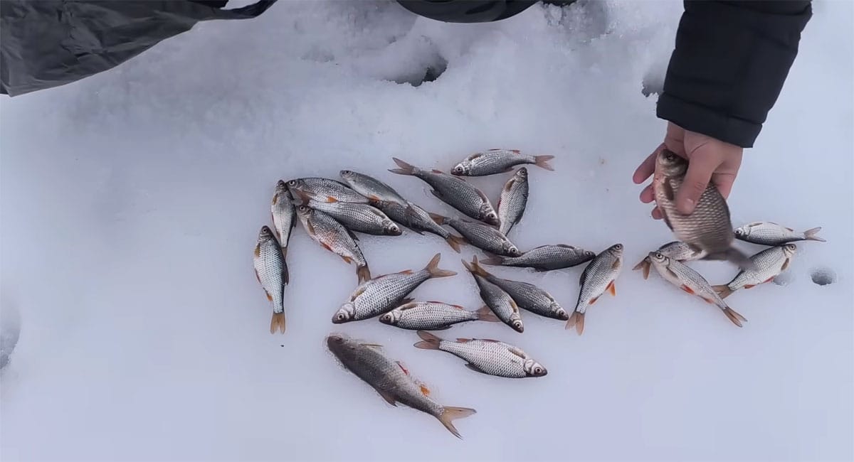 Плітка активно заходить у прикормлені лунки, реагує на гру і бере насадку майже одразу після опускання снасті. У моменти підходу зграї клювання починаються через 10–30 секунд, що дозволяє швидко набрати вагу улову.